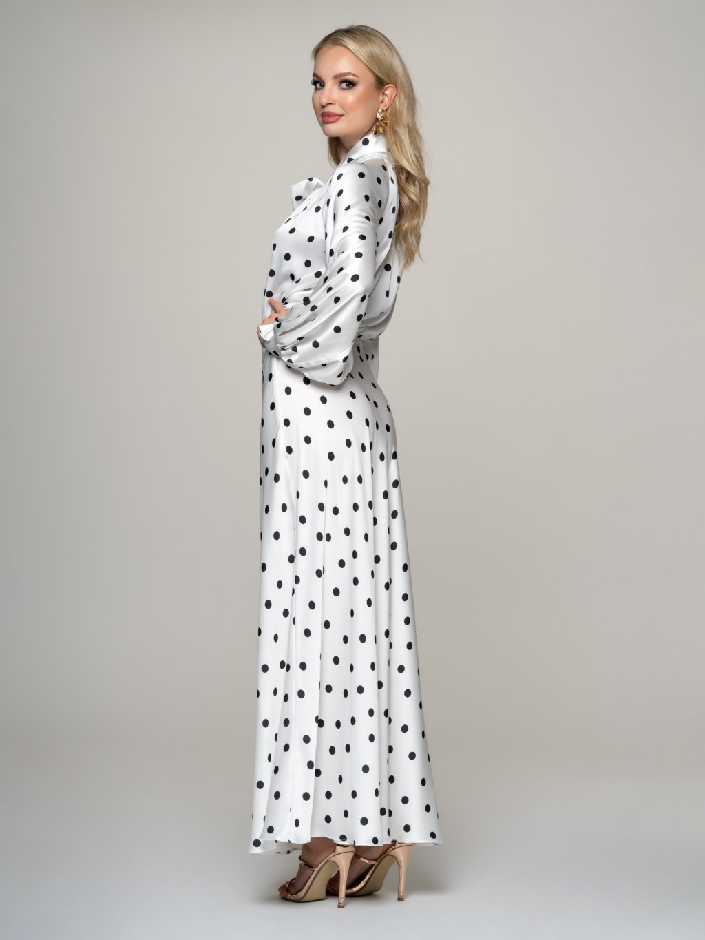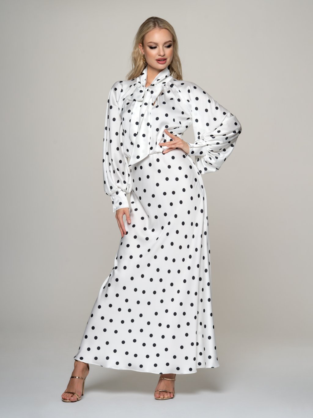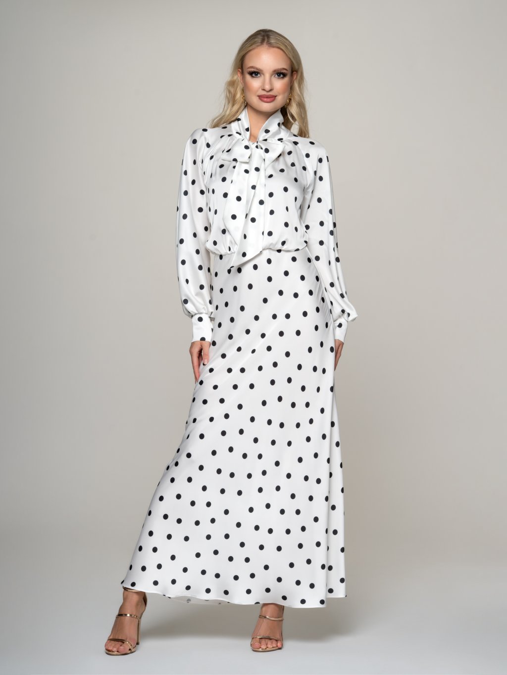 Romantické dlhé šaty z jemného Armani saténu v bielej farbe s potlačou bodiek v čiernej kontrastnej farbe.