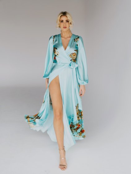 Zavinovacie šaty sú ušité z ľahučkého mušelínu, s ručne vypracovanými detailami na bordúrach a geometricky tvarovaných lemoch sukňovej a rukávovej časti a výstrihu. Lemy sú z jemnej francúzskej čipky.