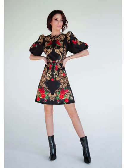 Šaty majú dĺžku po členky, vpredu otvorený rázporok, dlhý rukáv a zapínanie na zips v strede chrbta. Ukončenie pri krku je na zaväzovanie tenkou šnúrkou. Šaty sú mierne pružné.