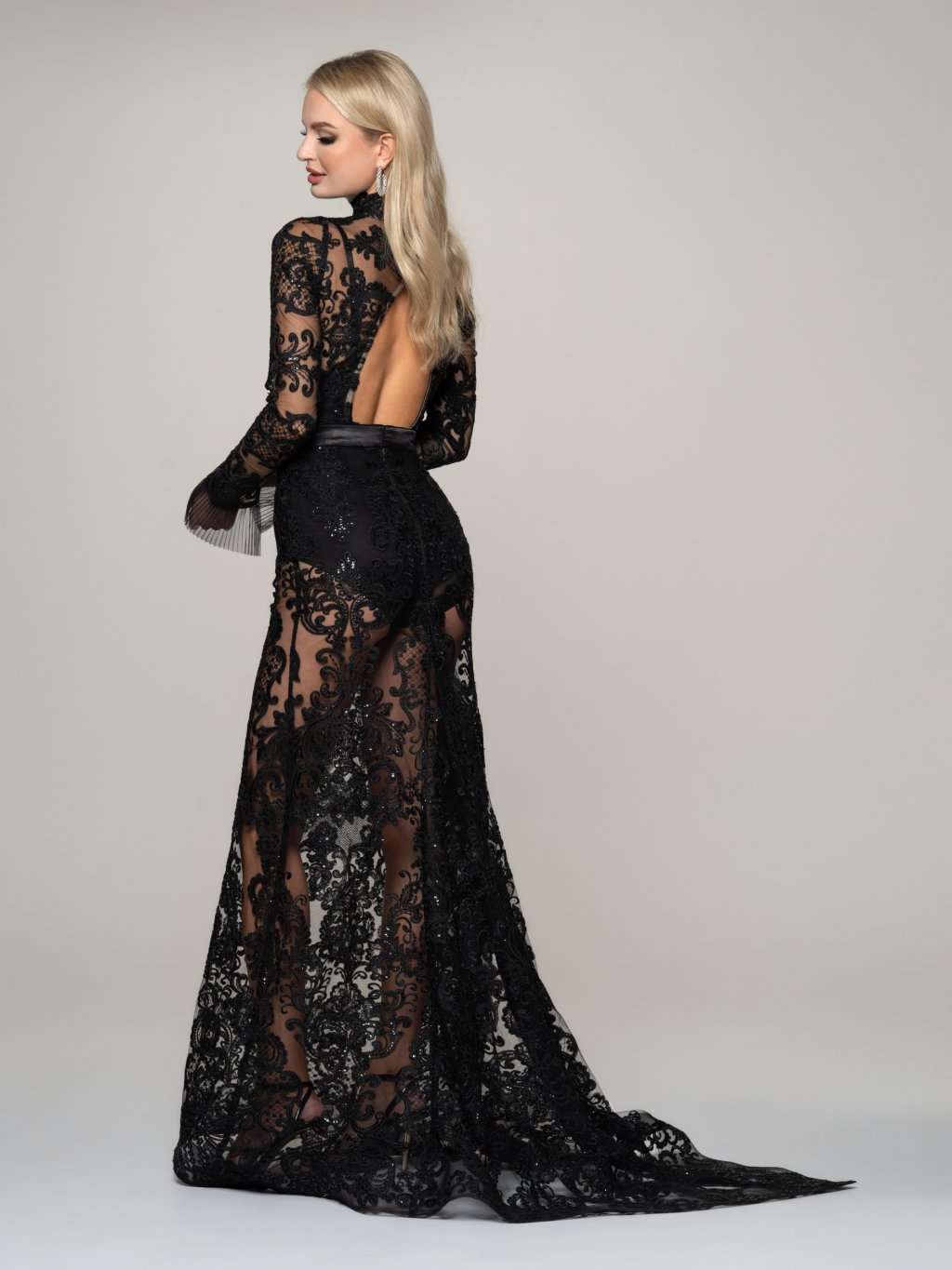 Stojáčik, predĺžené manžetky s plisom, odhalený chrbát, úzky strih.