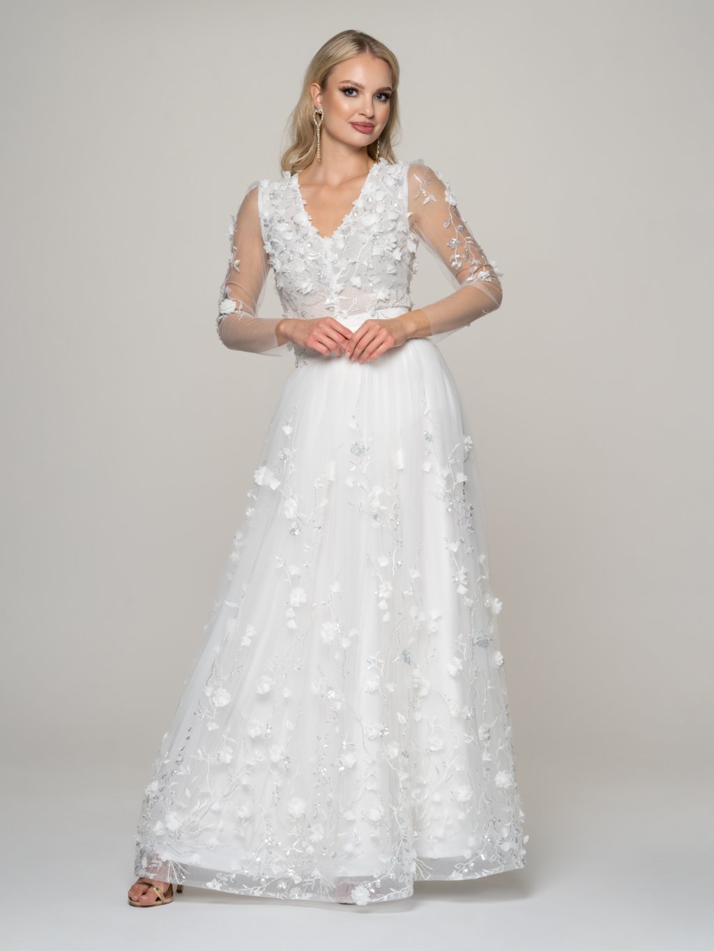Sukňa Diva Maxi je vyrobená z vyšívaného tylu, ktorý je ozdobený nádhernými 3D lupienkami a drobnými korálkami. Tieto detaily pridávajú sukni šmrnc a sofistikovanosť, a zároveň ju robia neodolateľnou vo svetle a pri pohybe.